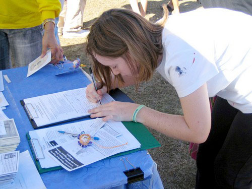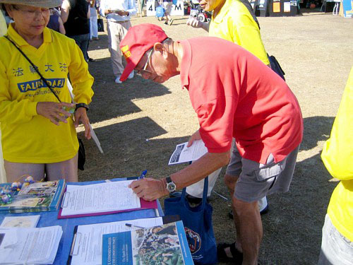 经过摊位的民众,被“征签制止活体摘取器官”几个大字所震惊,纷纷过来了解法轮功真相,并且排队签名表示支持。