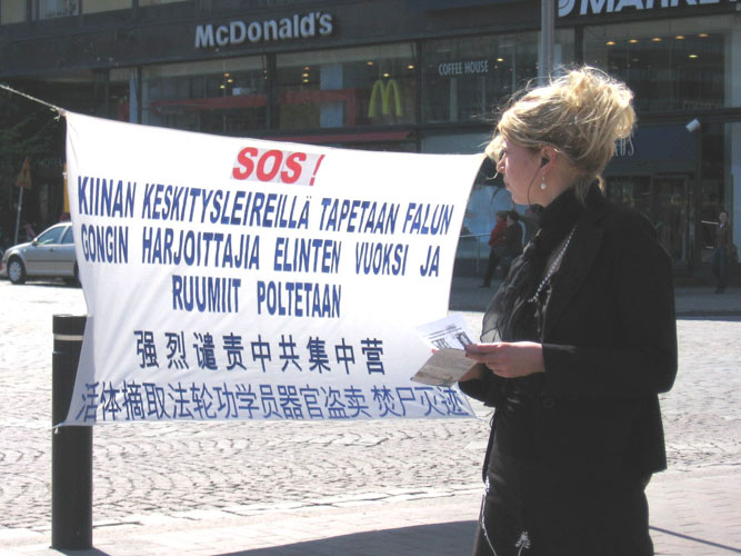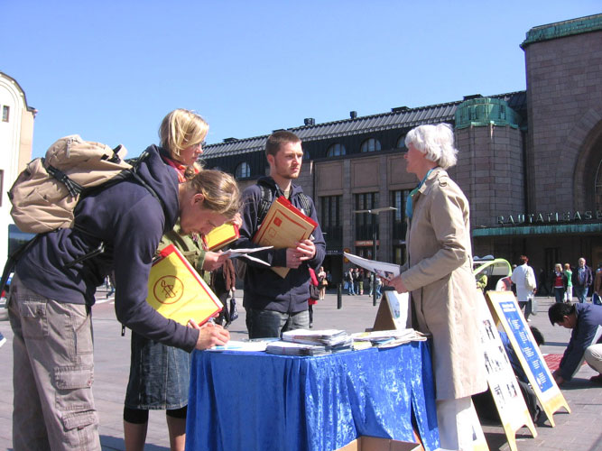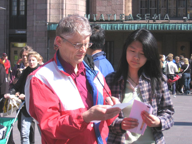 现场仍然摆放着留学生Sunny的父亲、法轮功学员张伟杰被武汉六一零绑架的迫害简介展板及Sunny的求援信,Sunny在一旁向关注的人们讲诉着真相。一位男士一下就拿了三封信要去投递给芬兰政要,以便帮助张伟杰。当Sunny向他表示感谢时,他又进一步了解情况,当Sunny告诉他,现在她不仅要努力营救被关押的父亲,同时更为妈妈的安危担心,因为妈妈在为父亲奔走中也一直受到威胁和恐吓。男士为听到的事实而震惊,不可理解怎么现今还有这种事发生,同时安慰Sunny希望一切都会好起来。