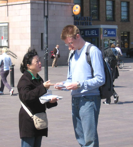 ![]() 芬兰学员Sinikka在小儿子Samuli的帮助下一遍遍的用高音喇叭向过往行人讲述着法轮功的真相 |