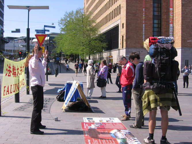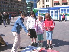 芬兰学员Sinikka让小儿子Samuli帮她拿着高音喇叭,她则一遍遍的向过往行人讲述着什么是法轮功以及中共对法轮功修炼者残酷迫害的真相,同时也告诉人们赫尔辛基的炼功点的地址和时间。就看到一位女士听着讲解,手随着演示功法的学员比划着炼功动作。