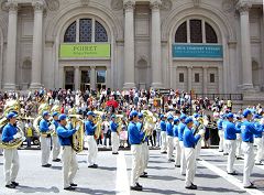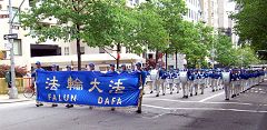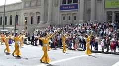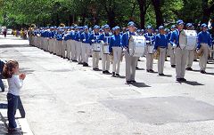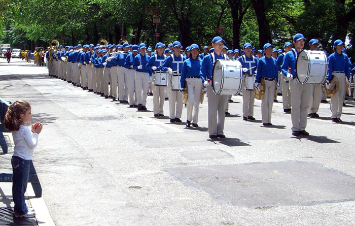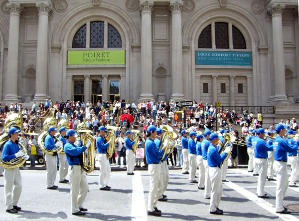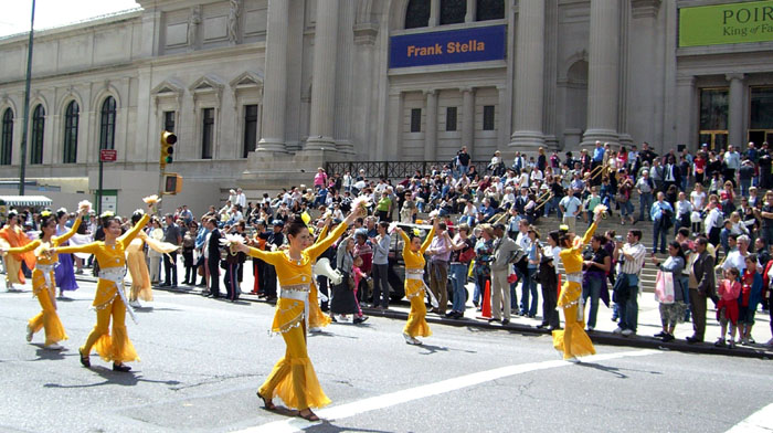 法轮功队伍以天国乐团开路,雄壮的乐曲震撼着人们的心灵;仙女队轻歌曼舞,展示着中国舞的韵味;炼功队伍演示着法轮功功法,舒展祥和;腰鼓队精神昂扬,令人振奋。两个小时的游行中,“法轮大法好”的歌声乐曲一直响彻五大道。人们微笑、鼓掌、挥手、竖大拇指、拍照、摄影,为法轮功喝彩、欢呼。