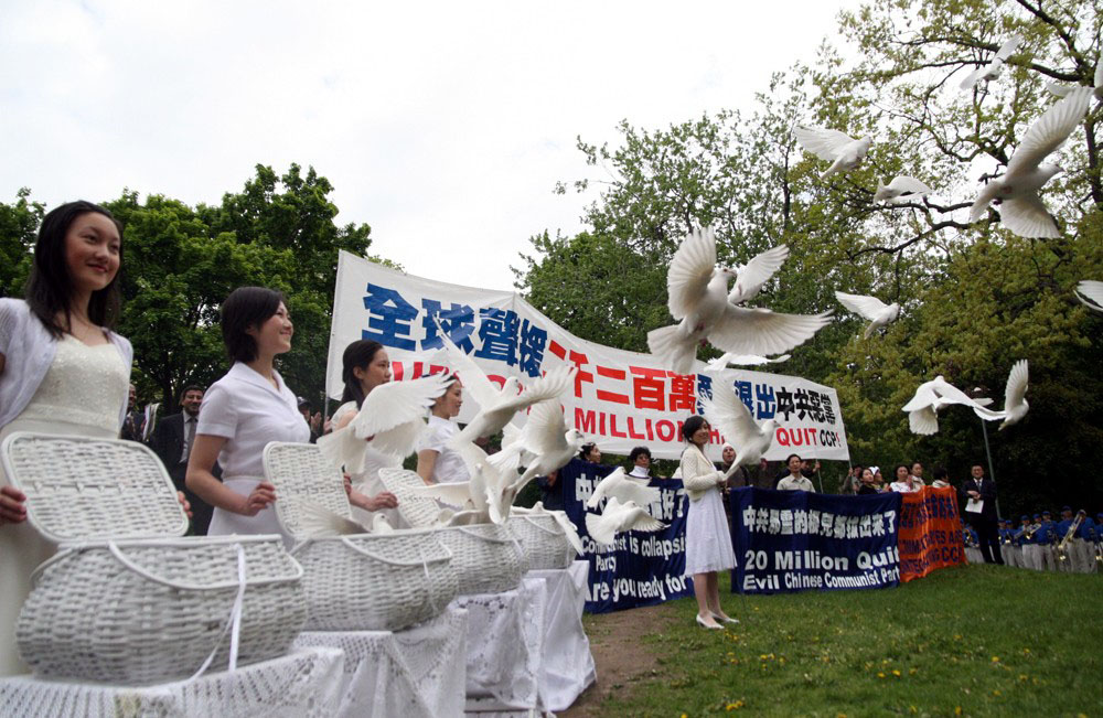 ![]() 集会期间,主办者放飞白鸽,象征民众摆脱中共邪灵束缚,生命得救。 |