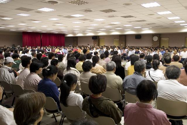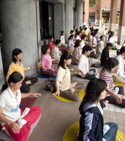 舞台表演之前,法轮功学员们首先为来宾播放了法轮大法在世界洪传的录像,然后带领观众一起炼功。祥和的能量笼罩着每个人,人们认真的在学习,好象期待很久的样子。