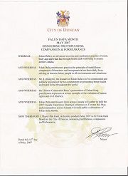 二零零七年五月十五日,加拿大不列颠哥伦比亚省邓肯市市宣布二零零七年五月为“法轮大法月”。