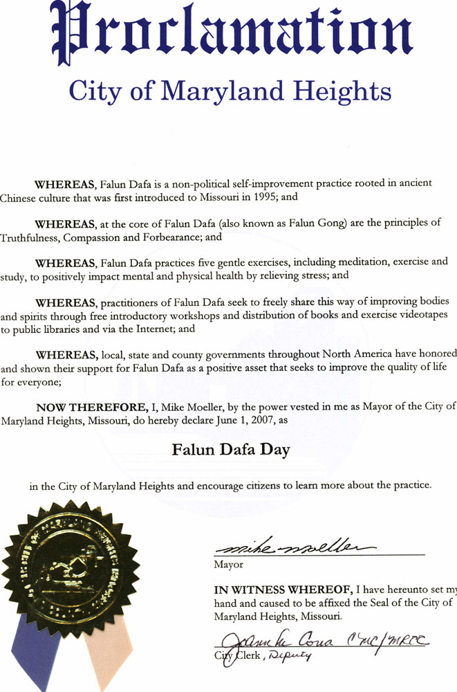 鉴此,我,迈克-默勒 (Mike Moeller),以密苏里州马里兰高地市(City of Maryland Heights)市长的名义, 特此宣布二零零七年六月一日为马里兰高地市