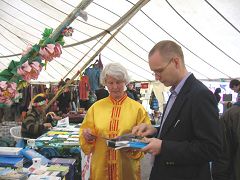 二零零七年五月二十六、二十七日两天,赫尔辛基一年一度的“世界村”活动又在火车站旁的Kaisaneimi公园再次登场,法轮功学员抓住这难得的民众聚集的机会,早早租好了摊位,准备了洪法资料并折叠了一批美丽的纸莲花,这一切都是为了能将法轮大法的美好带给更多的芬兰人民。