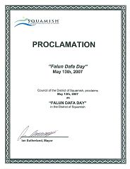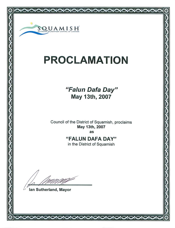 加拿大卑诗省Squamish地区议会宣布二零零七年五月十三日为Squamish地区的“法轮大法日”。