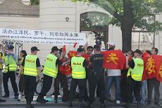 当中共代表团出来时,那群亲共人士冲到法轮功学员的前面,企图把学员和横幅挡住。警察迅速制止了这一行为,抓着中共的血旗,把那些挥舞旗子的人推回到他们原来的位置。而学员们继续庄严的高举着横幅。