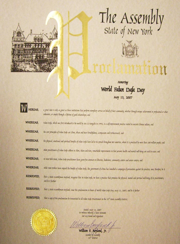 进一步决定,我,州议员博伊兰德,发此公告嘉奖二零零七年五月十三日为世界法轮大法日;