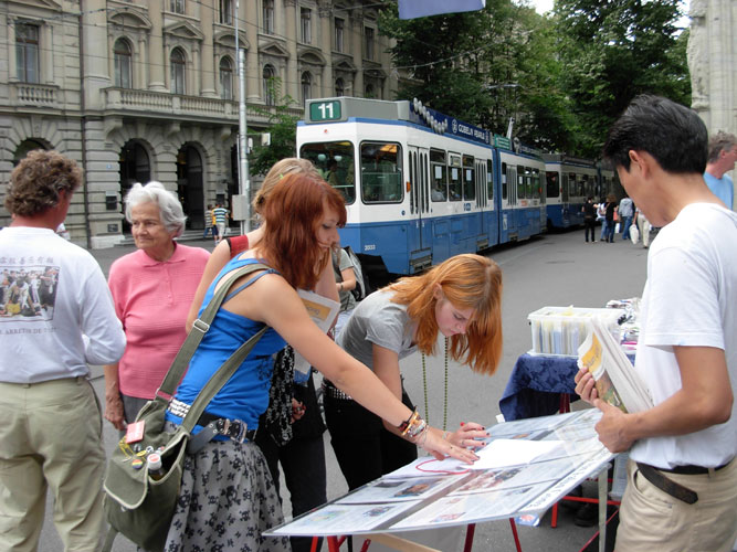 两位女士的表情由疑惑,到惊讶,到不忍,她们说,这一切迫害简直是太糟糕了,并问该如何帮助法轮功学员?学员告诉他们,可以签名呼吁瑞士政府和联合国调查活摘器官的罪行,也可以将她们所了解的关于中共迫害法轮功的罪行告诉更多的人,让他们不受中共谎言的欺骗,这对被迫害的法轮功学员而言也将是一个很大的帮助。