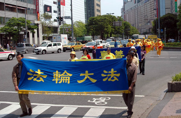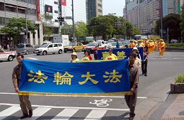 一点十分,游行队伍离开了天神中央公园,一路在警察的引导下,缓缓的走向游行的终点——驻福冈中领馆前。队伍以先导车开路,车上挂着“法轮功是利于人们身心健康的气功”的看板,队伍最前面蓝底黄字的“法轮大法”横幅格外醒目,接下来是学员们举着“真、善、忍”看板与横幅徐徐向前。队伍的中间是英姿飒爽的腰鼓队,伴随着“法轮大法好”的音乐,阵阵鼓声吸引了过往的路人,人们都不由自主的拿起手中的手机拍下了这一场面。在腰鼓队的后面是横幅队列,“世界需要真、善、忍”、“停止迫害法轮功”、“声援二千万退党”、“广传九评、利国利民”、“停止对法轮功学员的活体器官摘取”等等横幅随风舞动,行人们都瞪大了眼睛看着缓缓行进的队伍,发出了赞叹声:“了不起,好漂亮。”