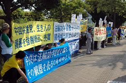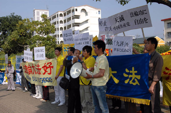 最后,游行队伍来到了终点——驻福冈中领馆前。法轮功学员静静的站成一排,手举着横幅与看板,面向中领馆宣读中、日文的声明,开始了为时一个小时的抗议活动。声明中告诫中领馆的官员们快快退出中共,快快了解真相,不要做中共的陪葬。文中指出:“中共邪灵的根都拔出来了,您还等什么?二千一百万人的觉醒正是中华民族的希望,不仅如此,而且这数字还在急速的上涨,现在每天都有三、四万人在大纪元网站上发表声明退出中共,这里有平民百姓、有学生、有知识份子、有军人,更有政府官员。众所周知的中共悉尼总领事馆一秘陈用林、前天津市公安局六一零官员郝凤军、中国沈阳市前司法局长韩广生、原山西省科技专家协会秘书长贾甲以及中共驻加拿大大使馆外交人员家属张继延,他们不仅退了,而且还现身说法,三退大潮势不可挡。”