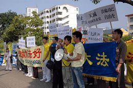 ![]() 法轮功学员宣读声明,劝中领馆人员脱离中共 |