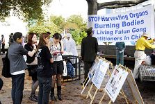 在活动快结束时,有一位西人女教师来了,看了介绍,她告诉一位法轮功学员:“这样的迫害太残忍,但您看到了,还有那么多的人很冷漠。我们应该征集更多的签名或以其它的方式给中国政府更多的压力,否则他们是不会改变的。我很想去中国,但我要等到迫害都停止了,我才会去。我会将你们的故事传递给大赦国际,让你们有更多的机会去发言。”