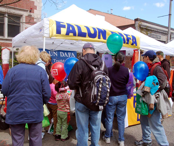 ![]() 渴望得知真相的人们纷纷来到法轮功摊位前 |