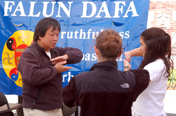 在学员们展示功法后,有母亲带着女儿当场学功;有一群青少年集体学功;有三三两两结伴来学功的;亦有询问学功地点和时间、表示想到炼功点学功的。