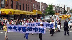 ![]() 二零零七年六月九日,纽约民众于布碌仑集会游行声援大陆二千三百万民众三退。民众打出“中共不等于中国”的横幅 |