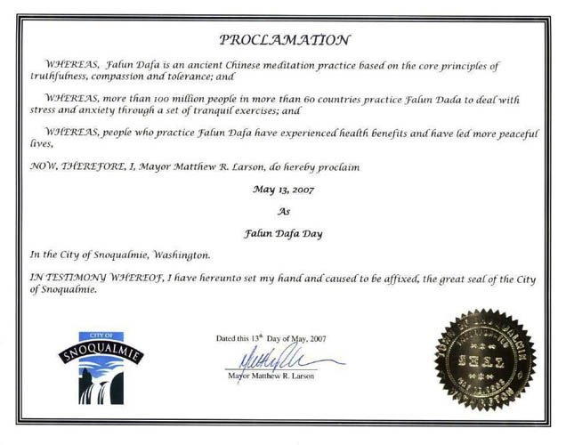 ![]() 华盛顿州斯诺阔米市褒奖法轮大法的奖状 |