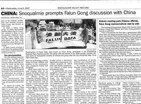 斯诺阔米市市长麦特•拉森,副总领事祝伟敏,和法轮功学员的会议也许是一个世界新记录。