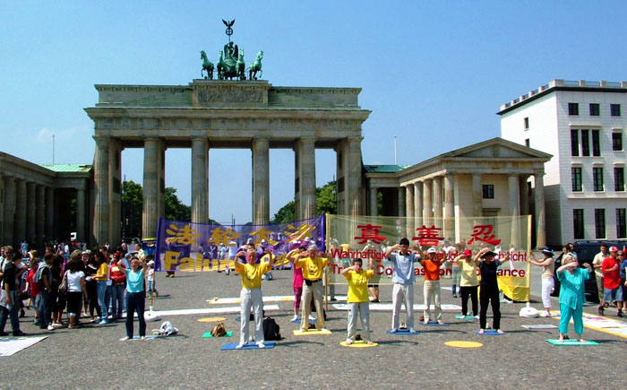 ![]() 法轮功学员在柏林巴黎广场上炼功洪法,人们纷纷来了解真相 |