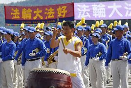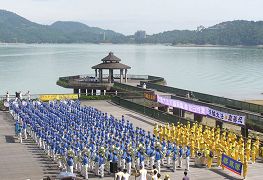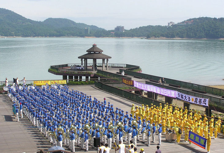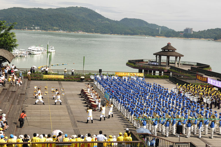 接着由来自台湾各地两百多位法轮功学员组成的天国乐团演奏乐曲。日月潭形象商圈发展协会理事长卢忠仪看完表演后表示,法轮功学员能够练得这么整齐雄壮真不简单,这样的表演实在太好了,为日月潭增色不少。他表示要建议(日月潭国家风景管理处)处长时常邀请这些团体来表演。