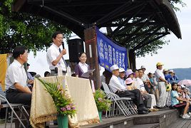 ![]() 日月潭所在地的鱼池乡乡长廖学辉致词说:法轮功的精神能净化人心,阳光普照代表法轮功能发扬光大,希望大法带给社会祥和。 |