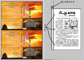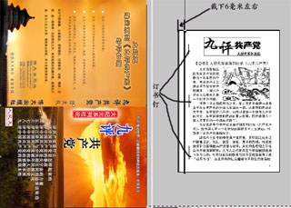 方法:订书针稍微往里钉一些,左侧裁掉六毫米左右,粘上封面即可。九评的封面必须用无边距打印,用彩喷纸但打印介质类型选择亚光照片纸效果好。