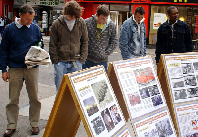 ![]() 人们仔细的观看揭露中共暴行的展板 |