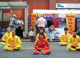 艺术节开始了,人们渐渐的多起来了。艺术节的组织者主动邀请学员们去露天的展台上演示法轮功功法。在前两年,学员们曾经要求表演,但未获准许。去年,主办者注意到法轮功学员的摊位前驻足观看功法的人数很多,所以今年特意邀请学员们表演。展台在艺术节的中心位置,是一个所有观众都能看到的好位置。