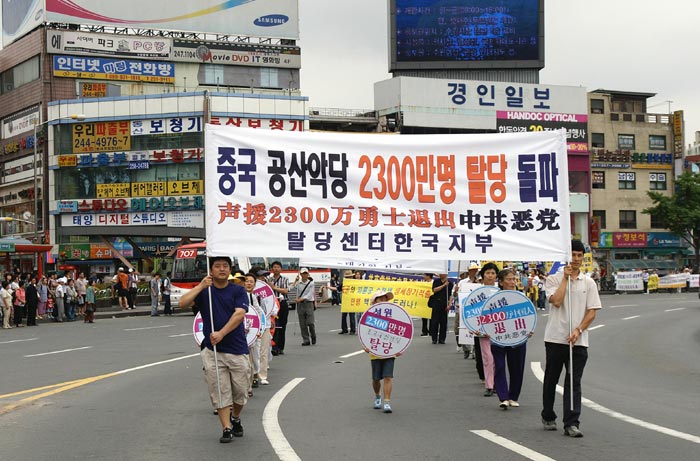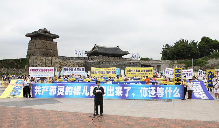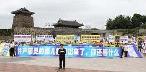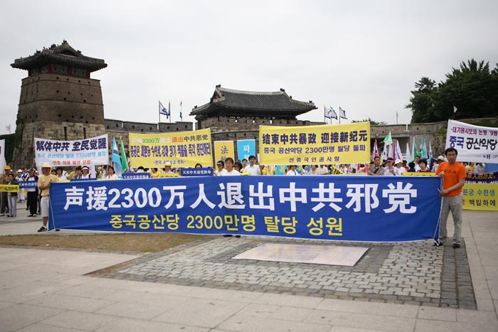![]() 6月24日,韩国退党服务中心在临近首尔的水原市举办了中国民众2300万三退声援集会和游行。背景建筑物为联合国教科文组织指定的世界文化遗产----水原华城 |