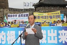 ![]() “法轮功受迫害真相联合调查团(CIPFG)”亚洲分团韩国团长的郑求辰先生在游行前的集会上发言 |