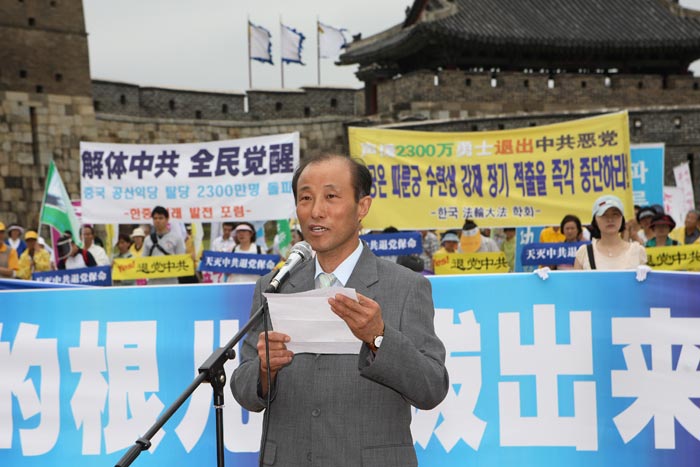 ![]() 6月24日,韩国退党服务中心在临近首尔的水原市举办了中国民众2300万三退声援集会和游行。发言者为水原退党服务中心代表曹宇铉(音) |