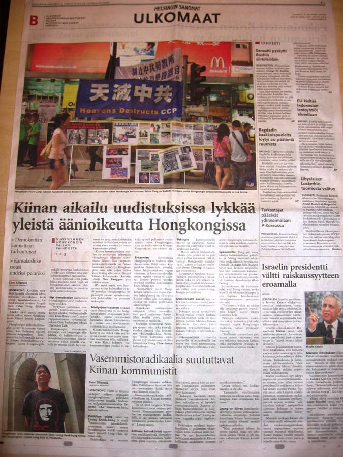 文中写道:香港和中国其它城市不一样,在街头你就可以看到国外报纸;在公园你能看到年轻人征签呼吁信;你还可在市中心看到法轮功的横幅。