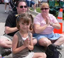![]() 瞧!十岁的麦奇和父母正对着法轮功学员的花车合十呢! |