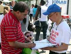 一位戴着眼镜的先生正和他的家人、朋友在公园里边用午餐边聊着天。当他看到关于中共活摘法轮功学员器官的资料后十分的气愤,连连的摇着头。同时他也对法轮功学员持续讲真相的努力很感动。他说,你们真了不起,今天大家都在和家人一起休闲、娱乐,而你们却这么辛苦的在做着这样一件有意义的事。我可不可以给你们一些钱帮助你们?学员向他表示感谢,并说我们不收捐款,但希望您能在反迫害的签名簿上签名。他说那是当然的啦!他不但自己签了名,还对和他一起用餐的家人和朋友们说:这个字我们一定要签。我去过中国,有一些中国的朋友,对中共的独裁暴政我是深有体会的,那里没有法律可言,人们没有自由。我相信它们(中共)是能干的出来这样的事情的。于是小小的签字簿在这个一行七人的二张桌子上整整的转了二圈。