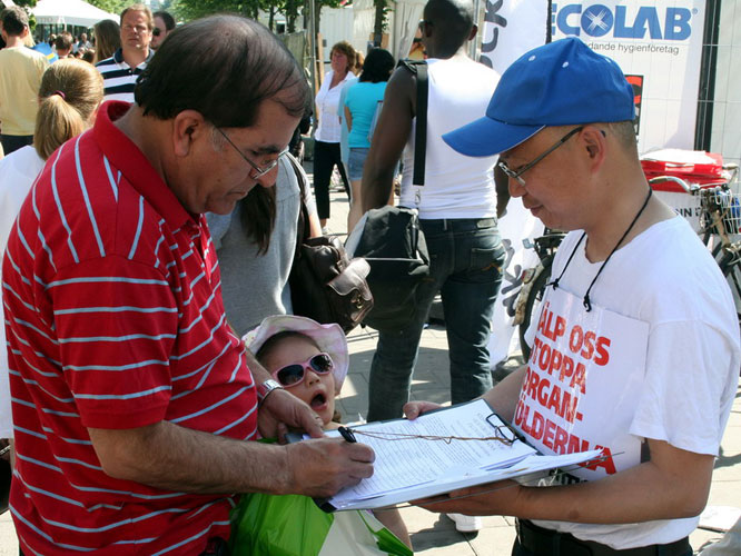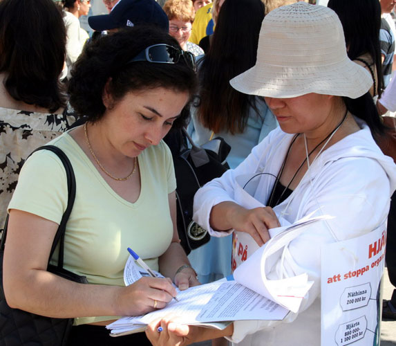 当天的游人中,还来了不少的中国人,他们大多都接了真相资料和《九评共产党》,表示要珍惜能出来的这次机会,回去一定要好好的看看,这在国内是不敢看的。有位文静的女士表示不能相信竟会有活摘器官这样的事发生,法轮功学员做了些介绍并准备了一些中文资料给她看。人群中走过来一对老夫妇,他们已经在瑞典居住二十多年了,他们说,对中共我们太了解它(的邪恶本质)了。为了表示对中共的强烈谴责,二位老人签上了他们的名字。有一个移民来自中国的中学生也签了名还高兴的拿了中文资料说要回去给爸爸妈妈看。