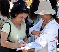 还有一位年轻人接过传单,毫不犹豫的签名反迫害,并挥着手高声冲着前面喊着:“YANNY你快点过来啊,这个事情很重要的!”当他看到女友也签上了自己的名字,高兴的笑了!