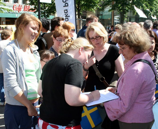 当得知这些签名将交给瑞典政府,敦促瑞典政府在几天后胡锦涛来瑞典访问时谈法轮功人权在中国遭践踏的问题时,善良的瑞典人反应强烈。有一位年轻的女士接过真相传单后一边走一边仔细的在阅读,等她读完一看已经走过很远了,她马上返回来签名反迫害。不一会只见她又返了回来,原来这回她又把她的先生也叫回来签了名后,才放心的走了。