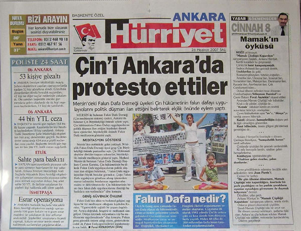 ![]() 土耳其发行量最大的报纸《自由报》大篇幅报道法轮功学员的抗议活动 |