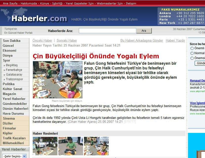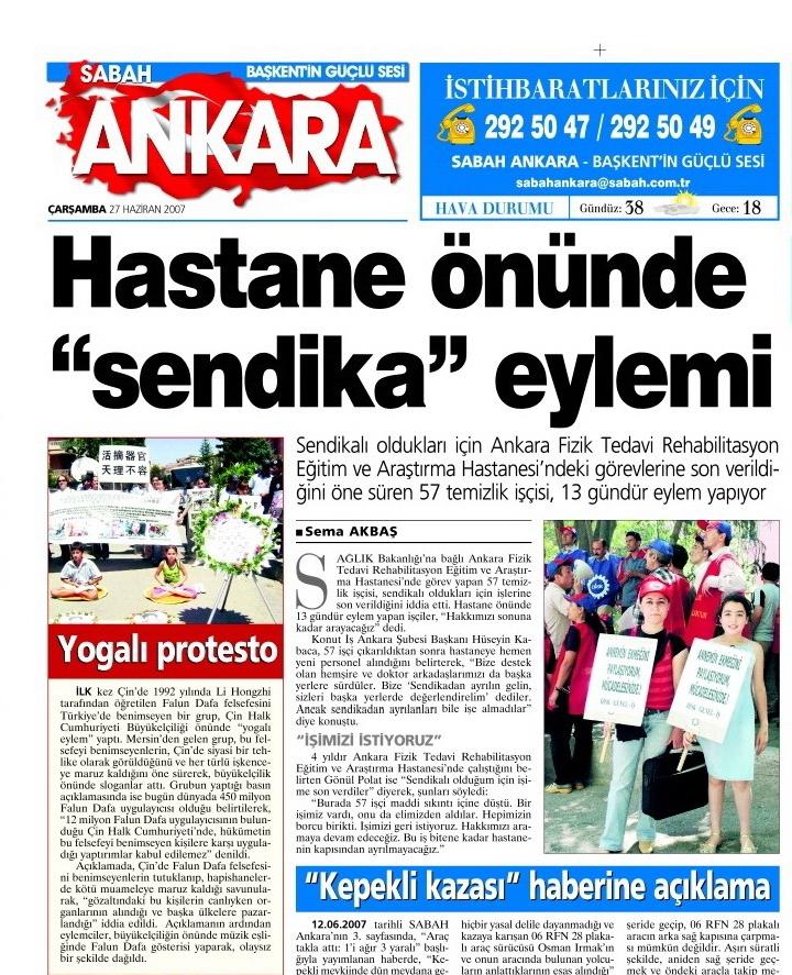 土耳其第二大报纸《早报》(Sabah),六月二十七日以“瑜伽式的抗议”为题,报道了这次抗议活动,同时简要介绍了法轮大法洪传的历史及其自九九年七月至今在中国所遭受的迫害情况。