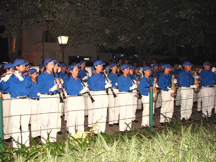 晚上,市庆活动之前,法轮功游行队伍中天国乐团,腰鼓队和仙女队利用这段时间展示各自的风采。但是演奏开始不久,就有数十位保安人员,冲进天国乐团的队列中,粗暴抢夺学员手中的法轮大法横幅、乐器。这时法律援助机构的十几位成员阻挡保安的粗暴举动,致使保安人员群体围攻法律援助机构成员。