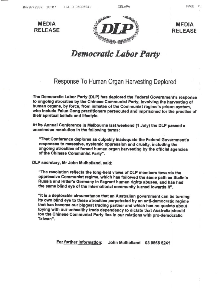 该党通过新闻稿表示,民主工党指责联邦政府对中共持续暴行的反应,中共政权从其监狱系统关押的人员身上强行摘取器官,其中包括因坚持精神信仰和生活方式被迫害和关押的法轮功修炼者。