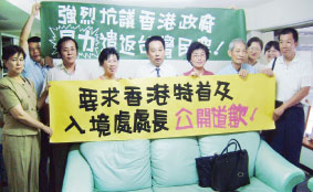 ![]() 高雄县民进党部主委陈明泽(中)与副执行长冯知叶(左三)共同谴责香港政府「七.一」暴力遣返案 |