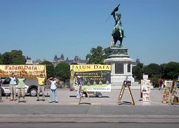 二零零七年七月十四日,奥地利法轮功学员在维也纳海尔登广场举行活动,纪念法轮功学员在中共政权持续八年的残酷镇压中和平反迫害,并向全世界民众揭露中共政权的暴行。