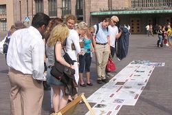 自从在二零零七年七月定为全球退党月,芬兰退党服务中心的义工和部份法轮功学员继月初的两次活动后,从七月九号到十四号,顶着烈日或阴雨,在该市人流量最大的赫尔辛基火车站旁,持续揭露中共八年来残暴迫害法轮功及中共暴政虐杀八千万中国人民的罪行,声援三退大潮。