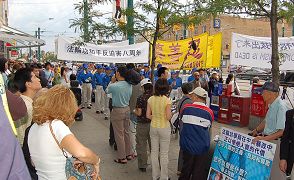 二零零七年七月十四日下午,加拿大多伦多地区法轮功学员在中区唐人街举办“停止迫害法轮功,声援退党潮”集会与游行,这是在法轮功学员和平反迫害八周年之际开展的活动。