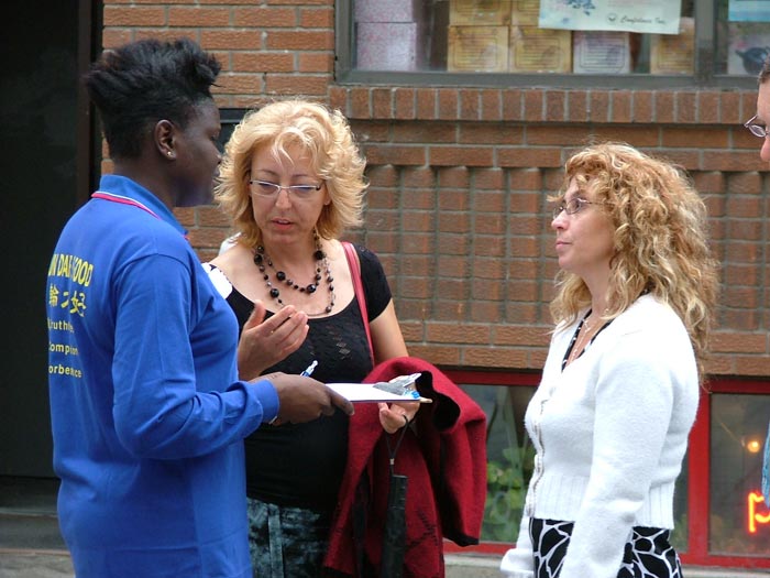 集会过程中,许多路人停下脚步,询问发生了什么事?当听到学员讲到中共的迫害时,无不为之震惊,纷纷签名表示支持法轮功学员反迫害。