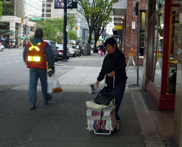 五月的一天,我讲好和江阿姨一起“体验生活”。我们约好六点半到那里。这时,这条白天熙熙攘攘的温哥华最热闹的商业街上,还只有稀稀落落的行人,街灯还亮着。我们一起取了预先已有人放在街边的报纸,一摞摞,总计五摞,放到小车上,我抢着拉上小车往ROBSON大街走去。