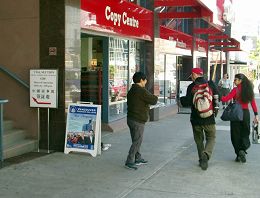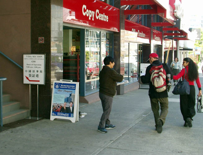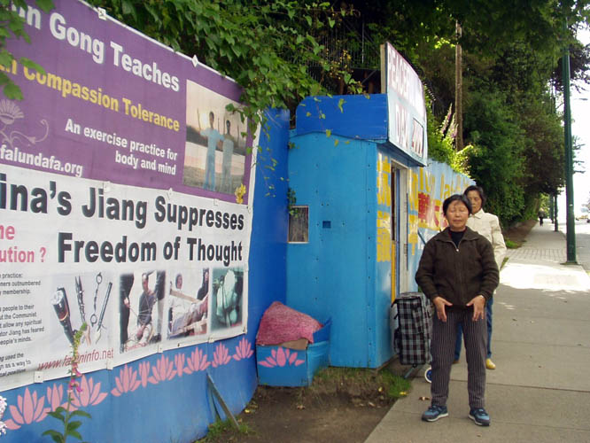 发完报纸已经是八点多了,江阿姨又拉着一些法轮功真相资料乘巴士赶往温哥华中领馆签证处,这里是江阿姨每周五的第二个活动项目──给办签证去中国的人讲法轮功真相。