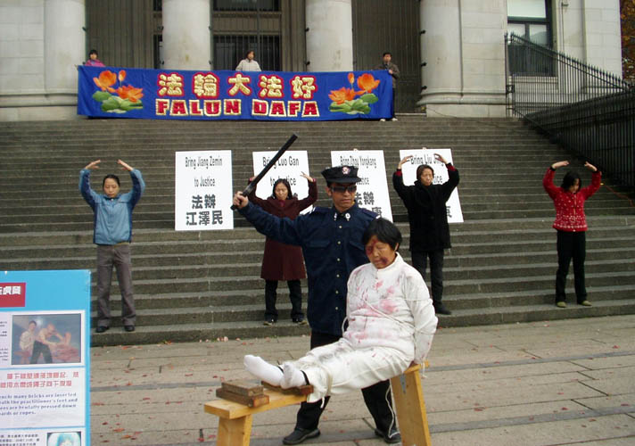 ![]() 江阿姨在演示中国大陆法轮功学员遭受的酷刑 |